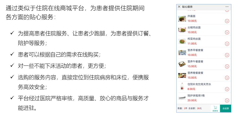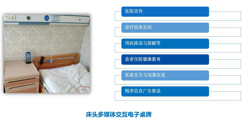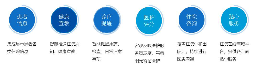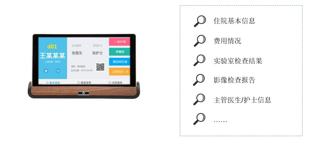 拓展床旁醫(yī)護、營養(yǎng)點餐、患者貼心服務(wù)、醫(yī)患交流、住院宣教、健康指導(dǎo)等功能,改善住院服務(wù)流程,改善患者就醫(yī)體驗,優(yōu)化醫(yī)患交互,改善醫(yī)療服務(wù)模式,提升智慧醫(yī)療的效率和水平。