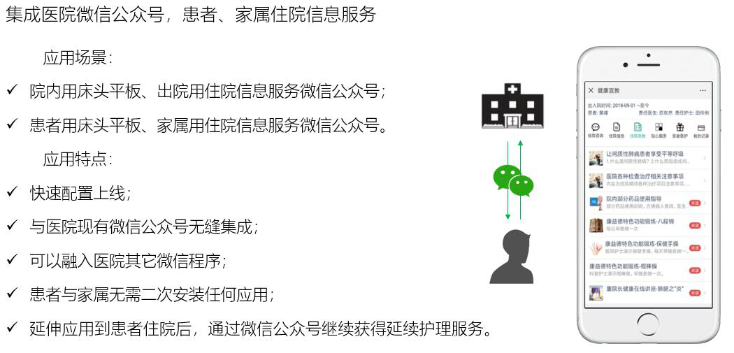 天坦患者住院信息服務(wù)系統(tǒng),通過患者床旁交互式平板、醫(yī)院住院信息服務(wù)公眾號,雙重服務(wù)模式,幫助醫(yī)院構(gòu)建從院中到出院后的患者全病程個案管理服務(wù)系統(tǒng),真正實現(xiàn)患者住院診療服務(wù)的提高,尤其是內(nèi)置的延續(xù)護理系統(tǒng),可以有效提高患者出院后的病情康復(fù)有效率與患者依從性。