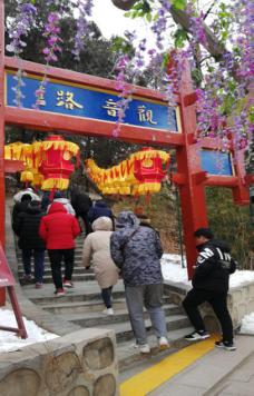 第二天早上9:00點,我們團體到達紅螺寺景區(qū),位于北京市懷柔區(qū)城北5公里的紅螺山南麓,距北京市區(qū)55公里,景區(qū)總面積800公頃,國家AAAA級旅游區(qū)。始建于東晉咸康四年(公元338)年,原名“大明寺”(明正統(tǒng)年間易名“護國資福禪寺”,因紅螺仙女的美妙的傳說,俗稱“紅螺寺”)。紅螺寺坐北朝南,依山勢而建,布局嚴謹,氣勢雄偉?,F(xiàn)在時節(jié)三九,北方冰天雪地,此時攀登由緩緩的山勢而上,身體慢慢散發(fā)熱量,爬到山頂已經是大汗淋漓,站在頂端俯視村莊,遠眺雁西湖畔、懷柔水庫,高矮錯落的房子......心境舒爽。