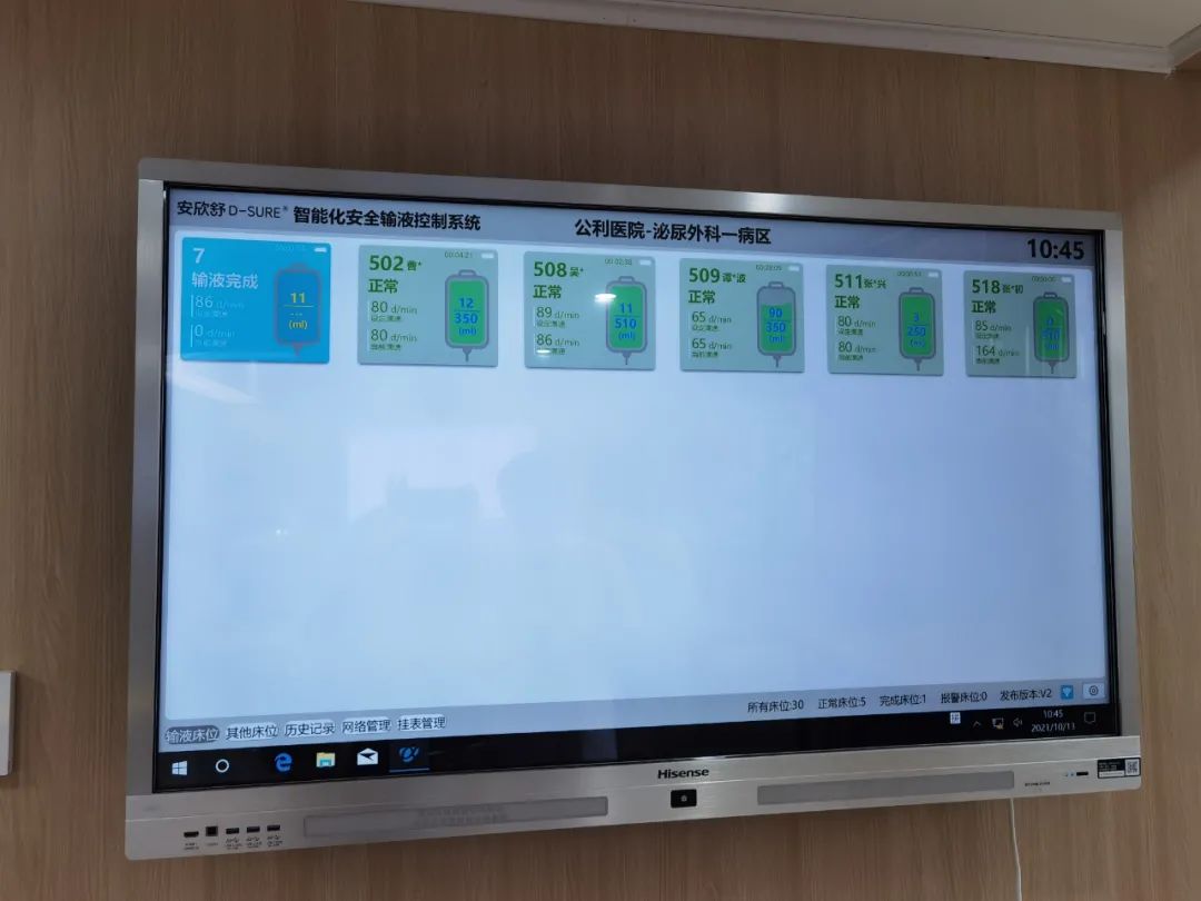 確定了用哪種輸液監(jiān)控技術(shù),變成“智慧輸液”卻還需要一個(gè)信息化工程,這就是信息護(hù)士產(chǎn)生的原因。以智慧輸液為例,要讓輸液信息“跑”起來(lái),就要一張“網(wǎng)”——具象地看就是智慧病房的7個(gè)屏:病床有兩個(gè)屏,大屏功能很多,不但可以看視頻、叫護(hù)士……還可以完成出院結(jié)算;小屏就是以前床頭的“小白卡”,顯示患者姓名、護(hù)理級(jí)別等。護(hù)士站有三個(gè)屏,一個(gè)大屏是輸液控制屏,顯示全病區(qū)的輸液情況;另外一個(gè)大屏相當(dāng)于寫字板,就是護(hù)士站常見(jiàn)的手寫黑板的“升級(jí)版”,除了即時(shí)更新醫(yī)囑外,還可以在病房看到正在做的手術(shù)情況等;此外還有護(hù)士站管理屏。再加上走廊屏、房間屏,所有的信息一次輸入、全程“跑動(dòng)”。